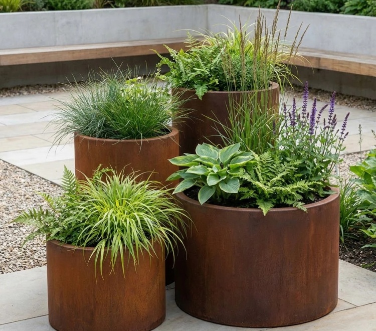 These 80cm large-size round weathering steel planters are designed for high-end gardens and landscapes. Made from high-quality corten steel, they offer excellent corrosion resistance and structural strength. The smooth, rounded shape of these metal planter pots softens the lines of a space, making them suitable for gardens, patios, commercial plazas, and more. In outdoor environments, corten round planters gradually develop a stable rust-colored protective layer, enhancing weather resistance and giving the pots a natural, warm visual appeal. The large capacity accommodates shrubs, small trees, or mixed plantings, meeting diverse greening needs. Bulk purchases and customization services are also available, making them an ideal choice for landscape engineering and horticulture projects.