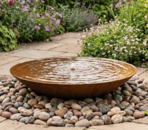 This large, curved, weathering steel water bowl combines a smooth, rounded design with a robust metallic feel, creating a visually striking focal point for your patio water feature.